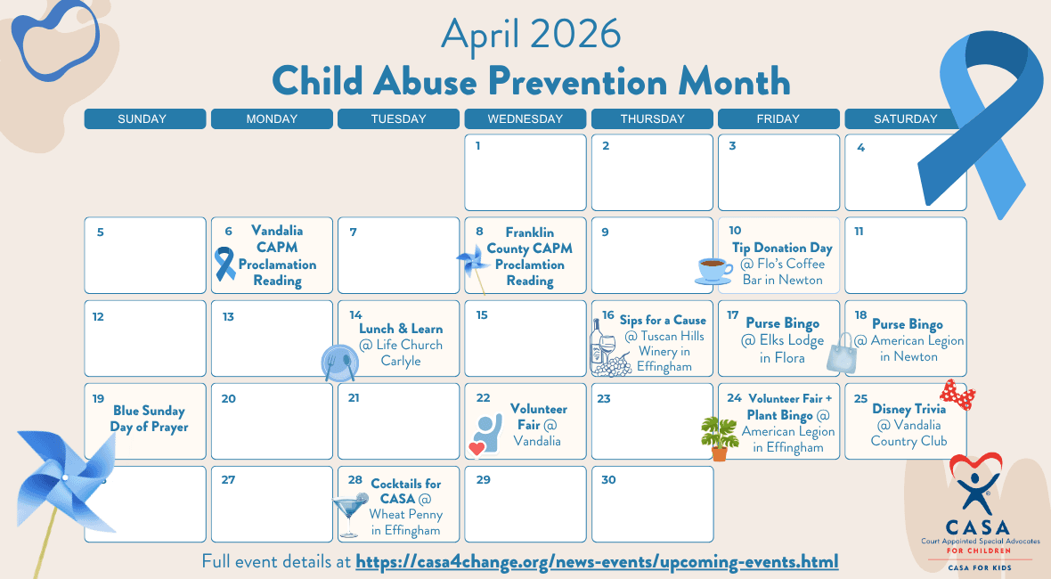 CASA for Kids' service area includes Clay, Clinton, Edwards, Effingham, Fayette, Franklin, Hamilton, Jasper, Marion, Wayne and White Counties.
