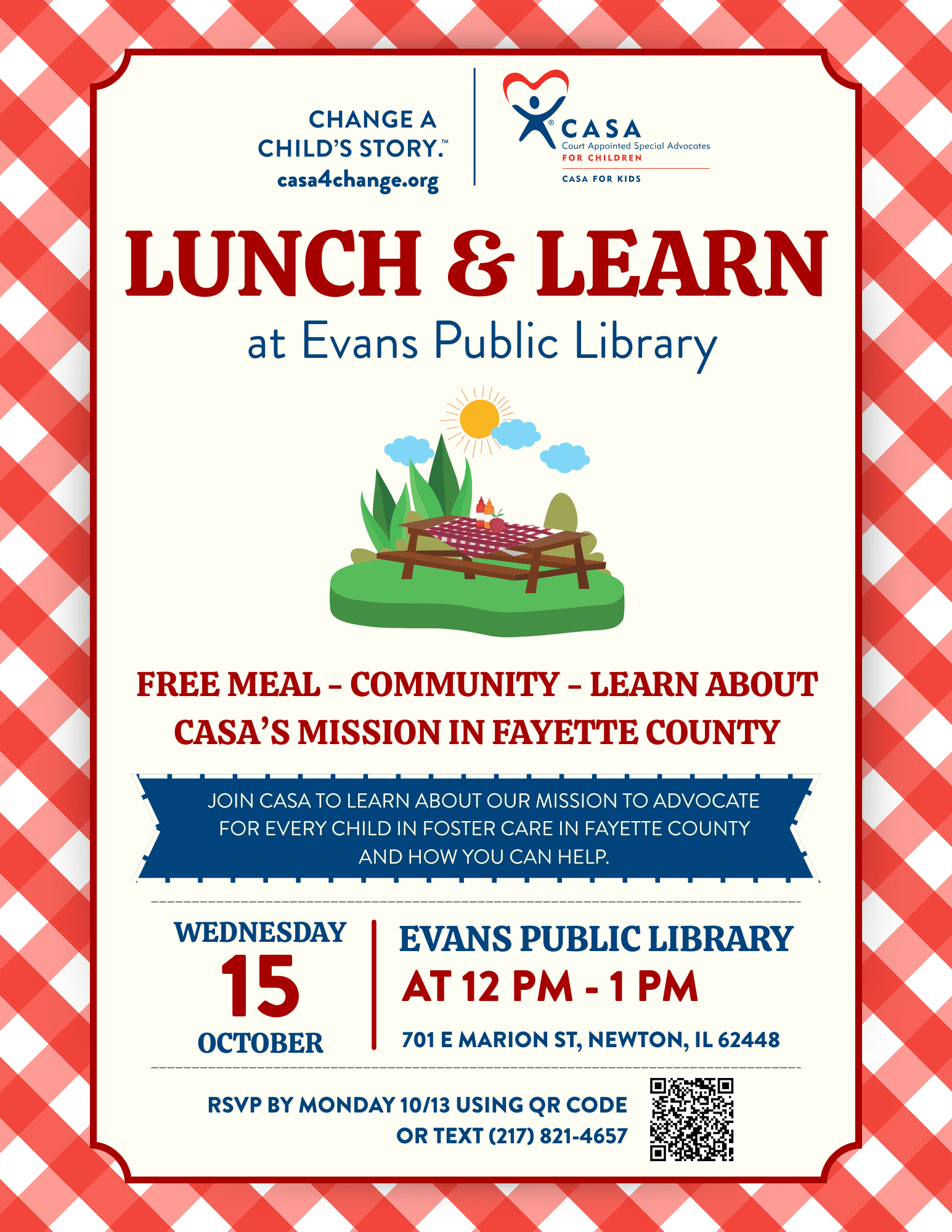 Invite a friend and join CASA for Kids for a free meal at Evans Public Library in Vandalia on October 15th at 12p. Our staff will share about CASA's mission to advocate for foster children and how you can help us provide an advocate for every foster child in Fayette County! RSVP by October 13th by texting (217) 821-4657 or using the link below: